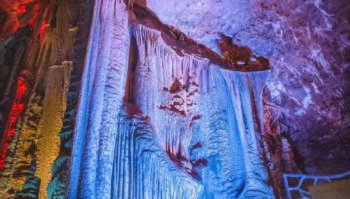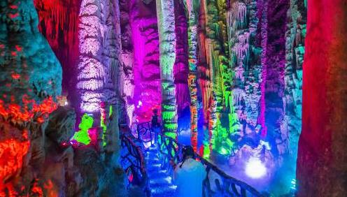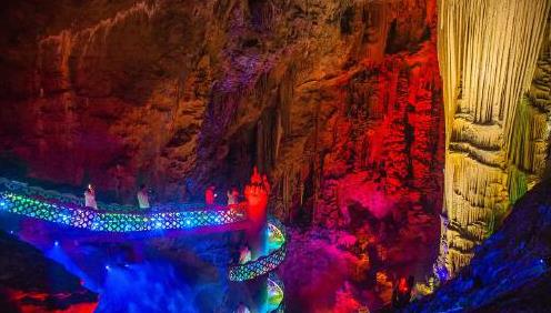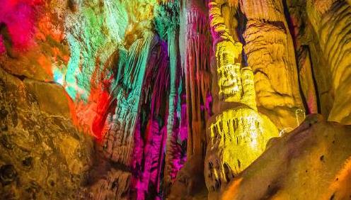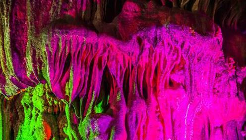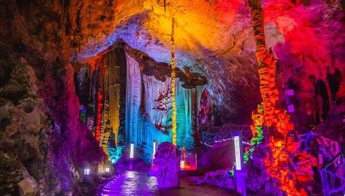 五光十色的灯光装饰着洞内,让钟乳石显得更加栩栩如生,同时增添了几分神秘的魅力,仿佛走进了一个璀璨的宝石秘境。